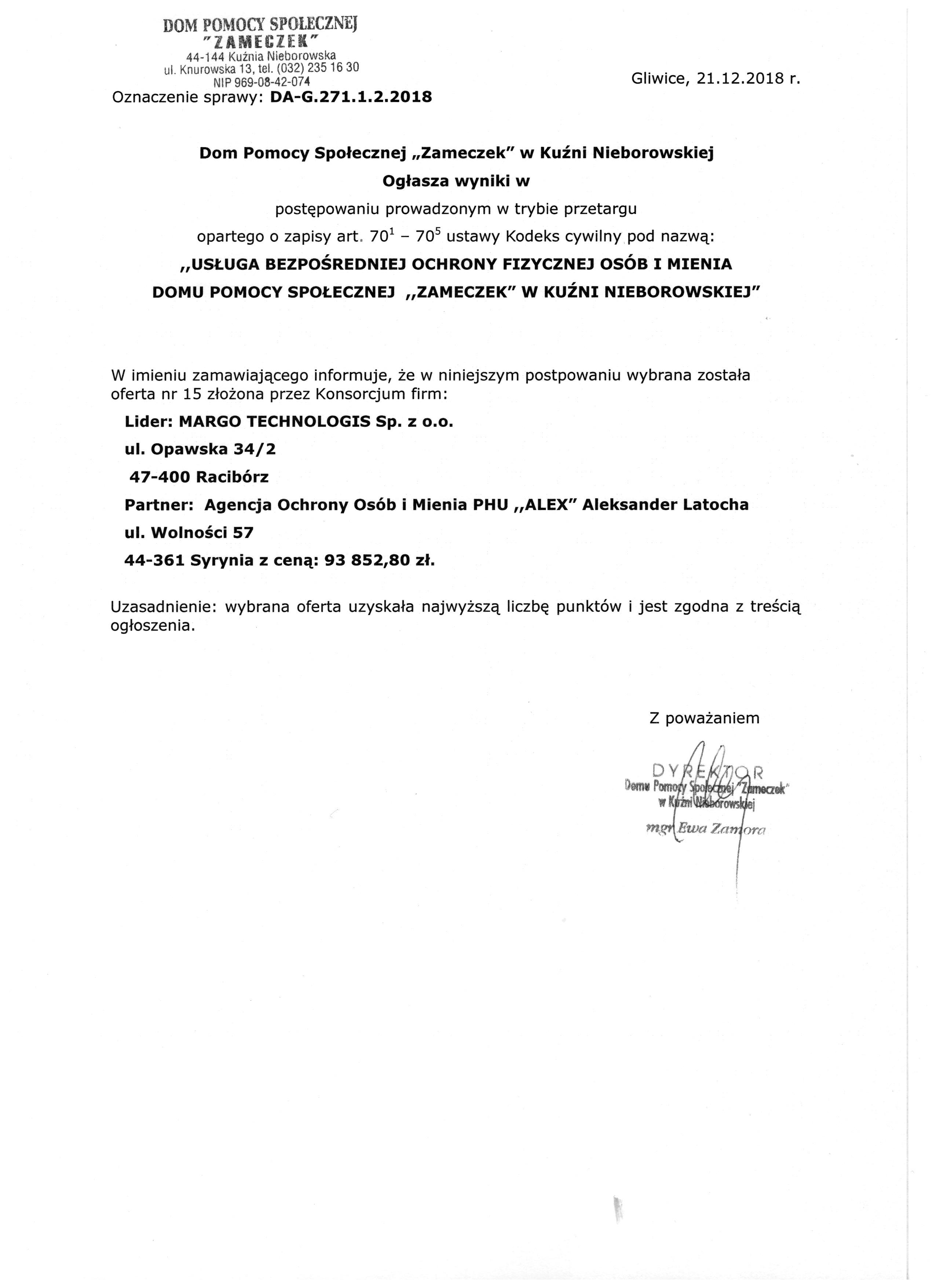Ogłoszenie wyników - "Usługa bezpośredniej ochrony fizycznej osób i mienia Domu Pomocy Społecznej "Zameczek" w Kuźni Nieborowskiej"; Oznaczenie sprawy: DA-G.271.1.2.2018.